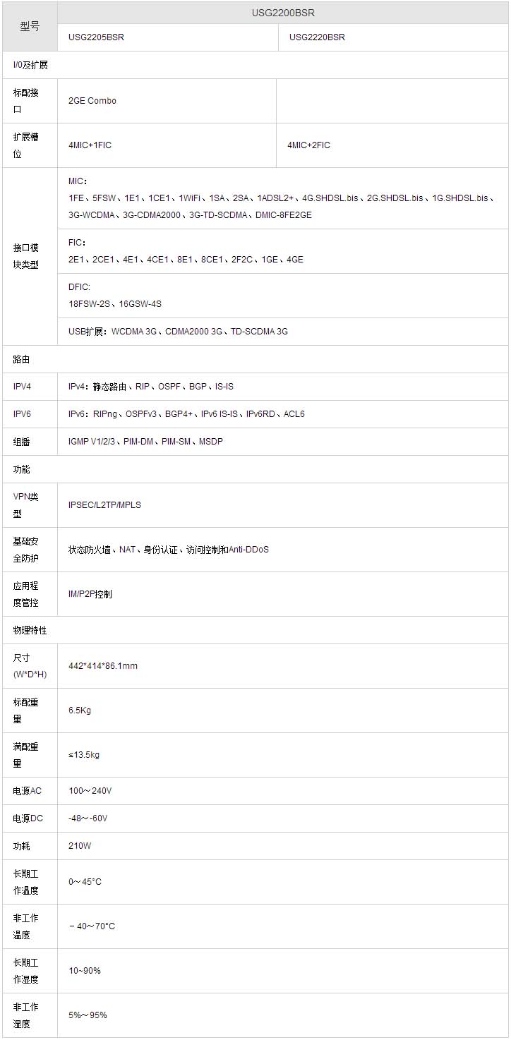 USG2200BSR接口類型豐富支持FE/GE、E1/CE1、串口、ADSL2+、G.SHDSL等,保護用戶投資,上(shàng)行(xíng)接入速率豐富,從64Kbps到1Gbps,客戶可(kě)以根據業務需求靈活選擇