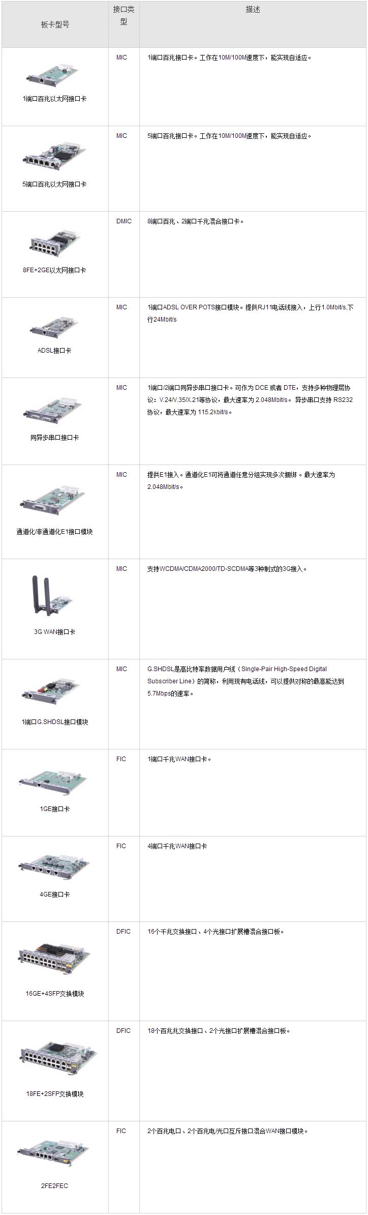 USG5100BSR支持多(duō)種接口卡,包括FE/GE/E1/CE1/ADSL/串口卡等,按使用槽位的不同,分為MIC、DMIC(雙MIC高(gāo))、FIC、DFIC卡(雙FIC高(gāo))。